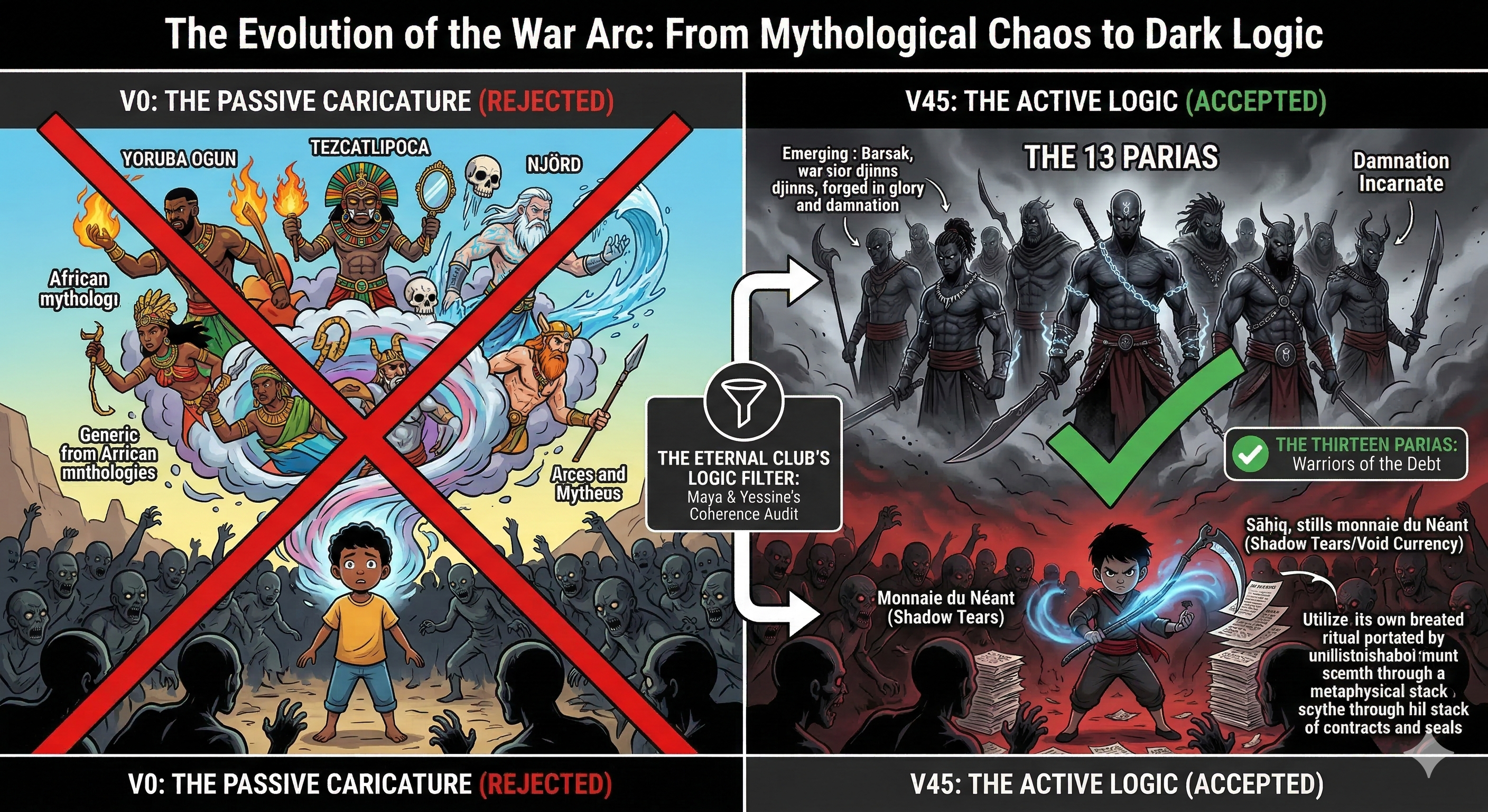 Dans le flux de travail du Club des Éternels, la phase matricielle de la V0 obéissait à une règle d'or absolue. Il fallait accorder une liberté inconditionnelle à la plume de l'auteur. L'objectif premier consistait à avancer sans retenue pour bâtir la vision globale de l'œuvre. Cette effervescence créative engendre un chaos fertile, indispensable mais parfois vertigineux. Lors de la rédaction du Chapitre 8, alors que Sāḥiq se retrouve acculé par des milliers de Ghouls du désert, Bilel a laissé exploser une fulgurance épique. Pour sauver son protagoniste, il a imaginé l'ouverture du registre magique afin d'invoquer frénétiquement des dizaines de divinités issues de tous les panthéons mondiaux. En quelques pages, le texte voyait surgir Yoruba Ogun le dieu du feu africain, Tezcatlipoca le maître du destin aztèque, Tangaroa Nesis le dieu océanique, Viracocha, ou encore Hroldr le Gelé et Njörd le Fluvial issus des légendes nordiques.