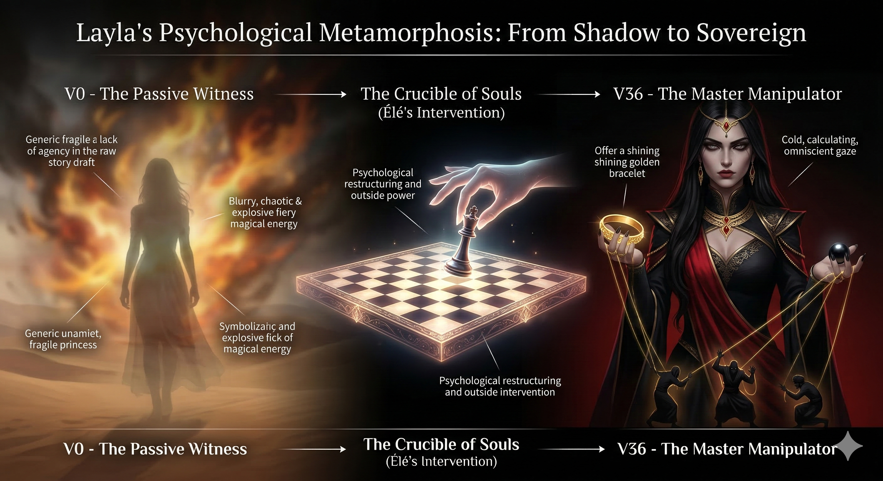 Entre le brouillon initial et l'accomplissement de la V36, Layla a cessé de servir de simple faire-valoir au héros. Grâce à ce travail méticuleux sur ses silences, ses calculs et sa cruauté stratégique, elle s'impose désormais comme l'entité la plus redoutable du livre. Elle est devenue la joueuse d'échecs qui tire les fils du destin de L'Architecte du Néant.