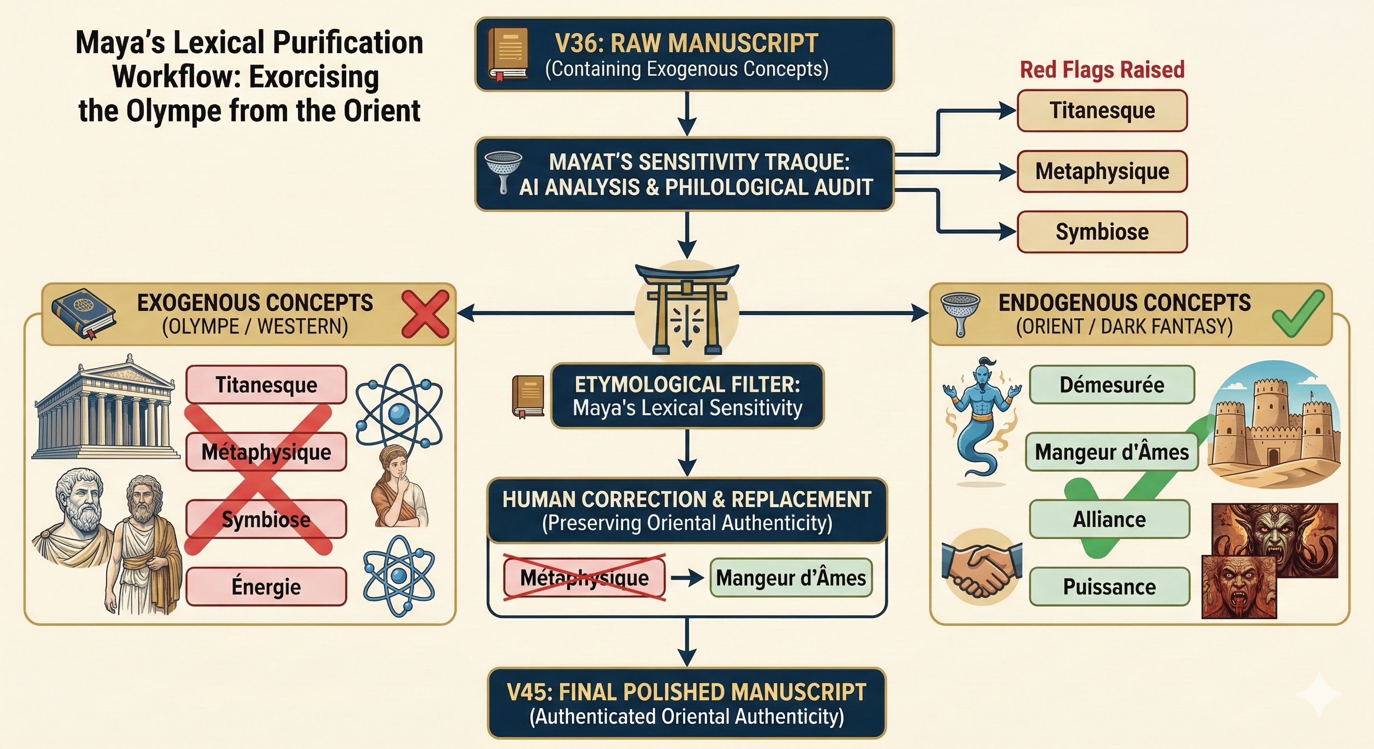 L'outil scannait le texte et levait des alertes. Mon intervention humaine prenait alors le relais. Je remplaçais ces termes exogènes par des mots à la résonance plus viscérale, plus ancienne ou plus neutre. Cette démarche visait à préserver une harmonie littéraire puissante où l'héritage oriental règne en maître absolu.